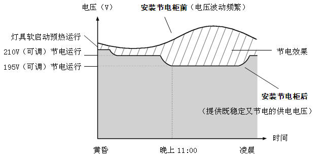 GGDZ照明穩(wěn)壓節(jié)電器根據(jù)用戶電網(wǎng)電壓的波動情況、照明負載的性質(zhì),對燈具實行智能穩(wěn)壓供電,調(diào)壓穩(wěn)壓,精度為±1~2%,隨時給燈具提供一個既穩(wěn)定、又能節(jié)電,還不會影響照明效果的供電電壓。用戶可根據(jù)自己的需要,自行設(shè)置輸出的節(jié)電電壓,對照明負載的運行時間和供電方式進行編程,降低照明燈具的電耗。(見下圖)
